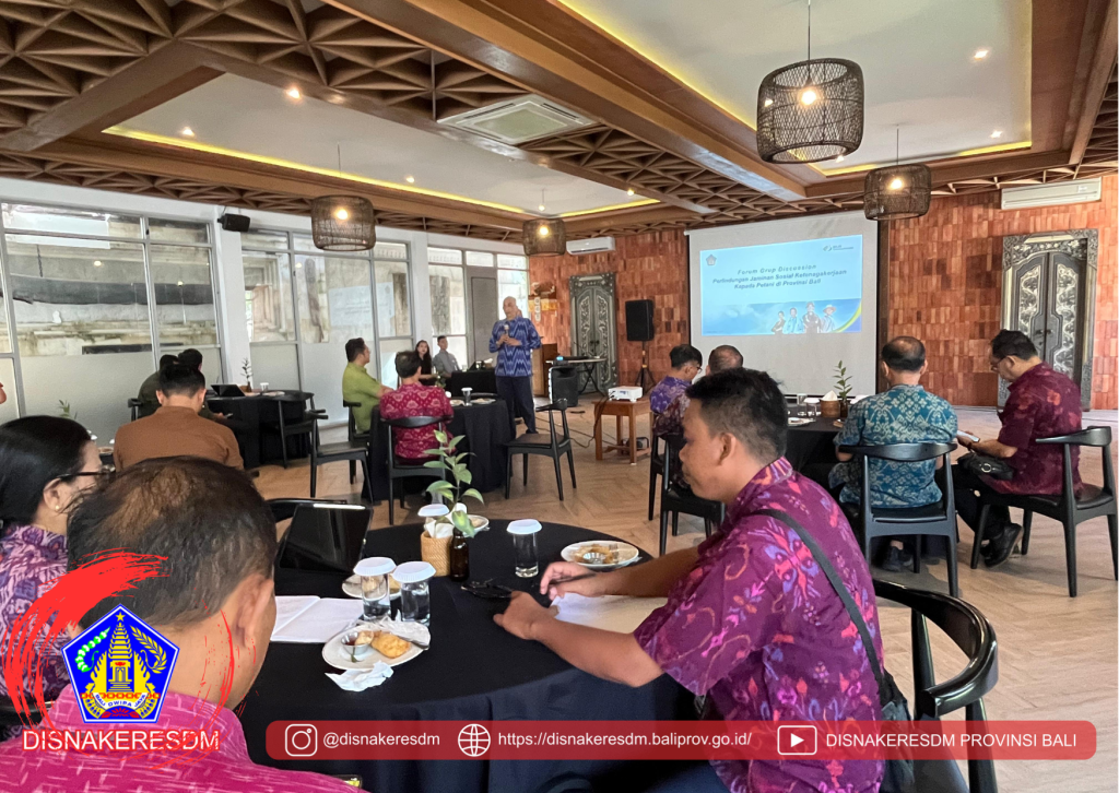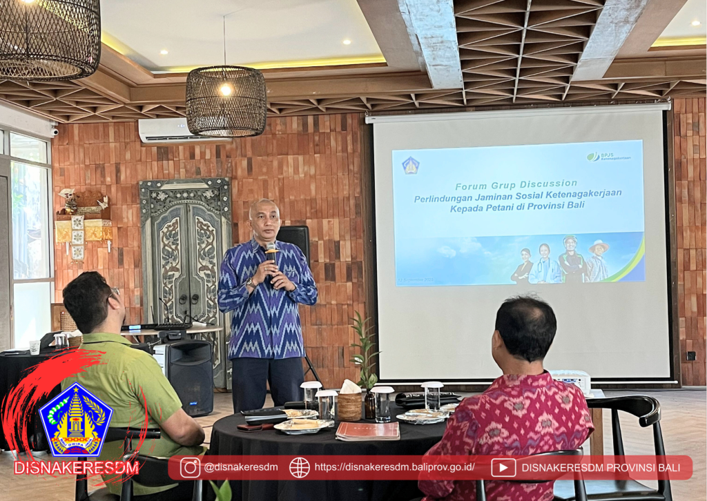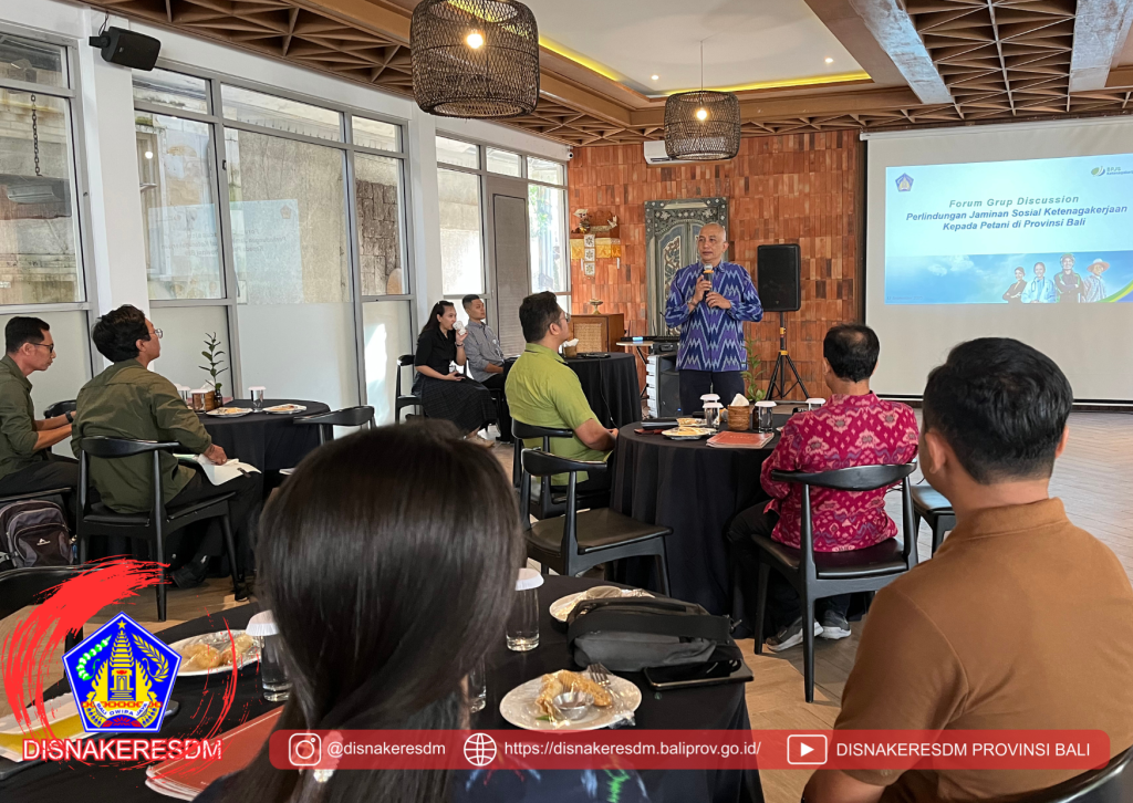 Kepala Dinas Ketenagakerjaan dan Energi Sumber Daya Mineral (ESDM) Provinsi Bali menghadiri sekaligus memberikan sambutan dalam kegiatan Focus Group Discussion (FGD) yang membahas Implementasi Program Jaminan Sosial Ketenagakerjaan pada ekosistem pertanian di Provinsi Bali.