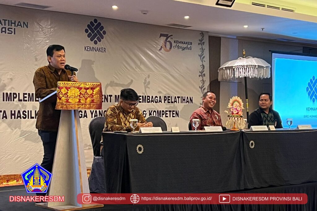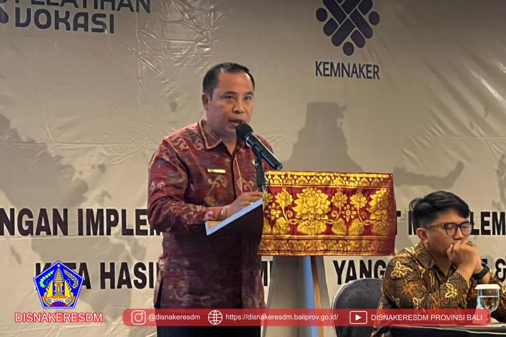 Bapak Kepala Bidang Pelatihan dan Produktivitas mewakili Bapak Kadisnakeresdm Provinsi Bali memberikan ucapan selamat datang dalam kegiatan Implementasi Pemetaan Mutu Lembaga Pelatihan Kerja (LPK) Tahun 2023 dan acara dibuka oleh Direktur Bina Kelembagaan dan Pelatihan Vokasi Kemnaker RI. Kegiatan ini diikuti oleh 60 peserta dari Provinsi Bali, NTB dan NTT.