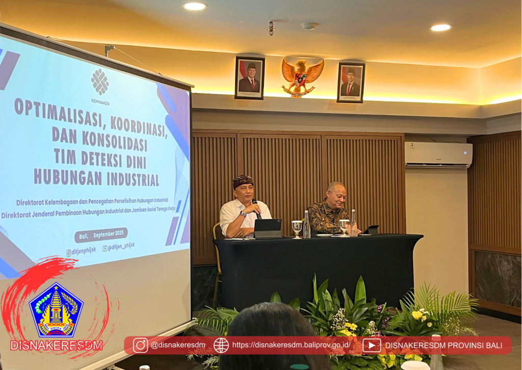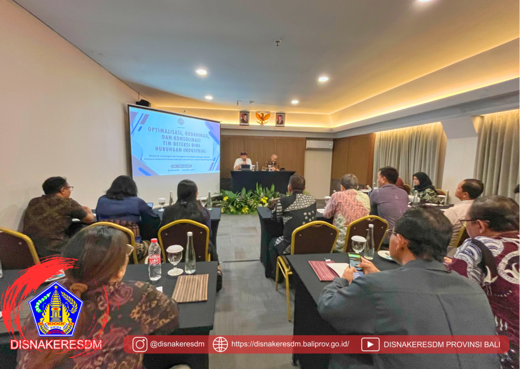 Kepala Dinas Ketenagakerjaan dan ESDM Provinsi Bali memberikan Sambutan pada Kegiatan Optimalisasi, Koordinasi dan Konsolidasi Tim Diteksi Dini Perselisihan Hubungan Industrial yang diselenggarakan oleh Direktorat Kelembagaan dan Pencegahan Perselisihan Hubungan Industrial (KPPHI) Ditjen PHI dan Jamsos Kemnaker RI.