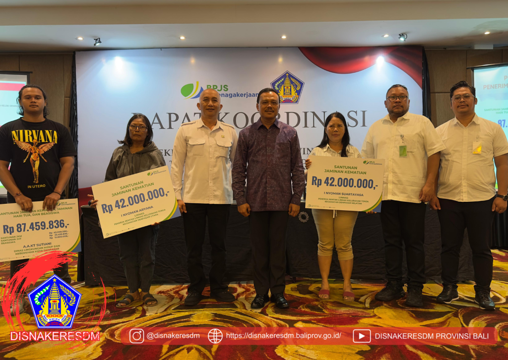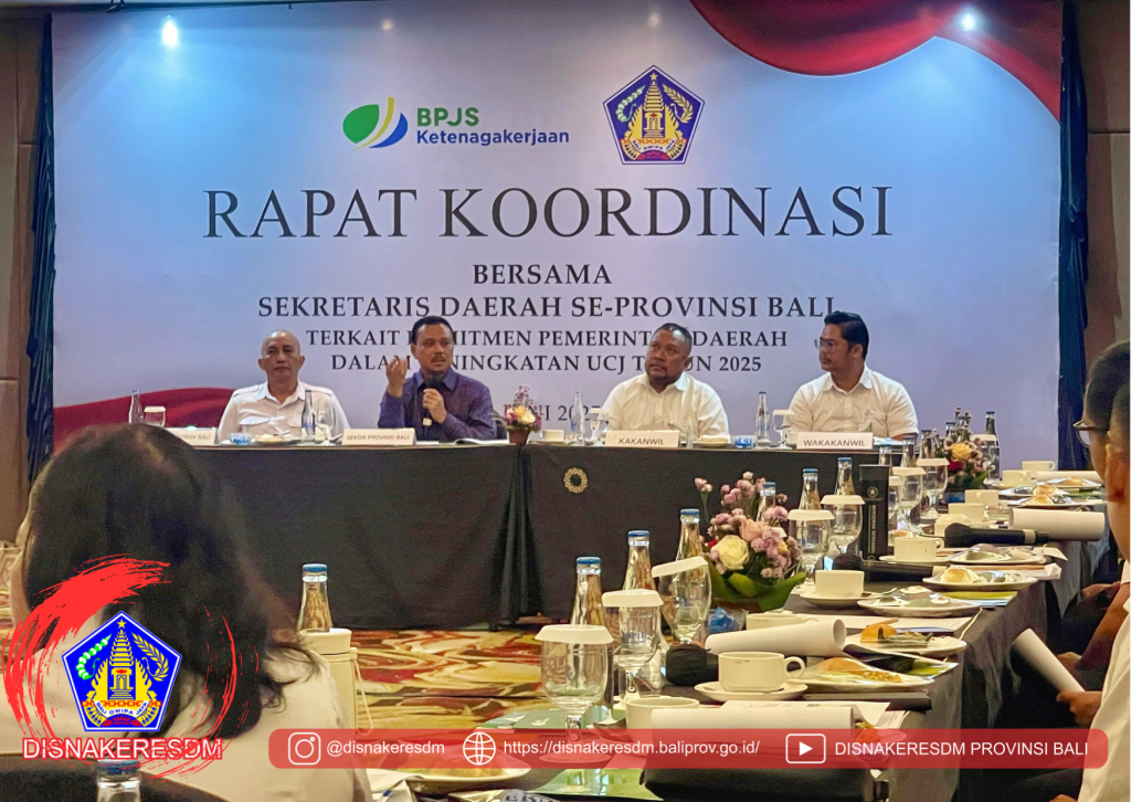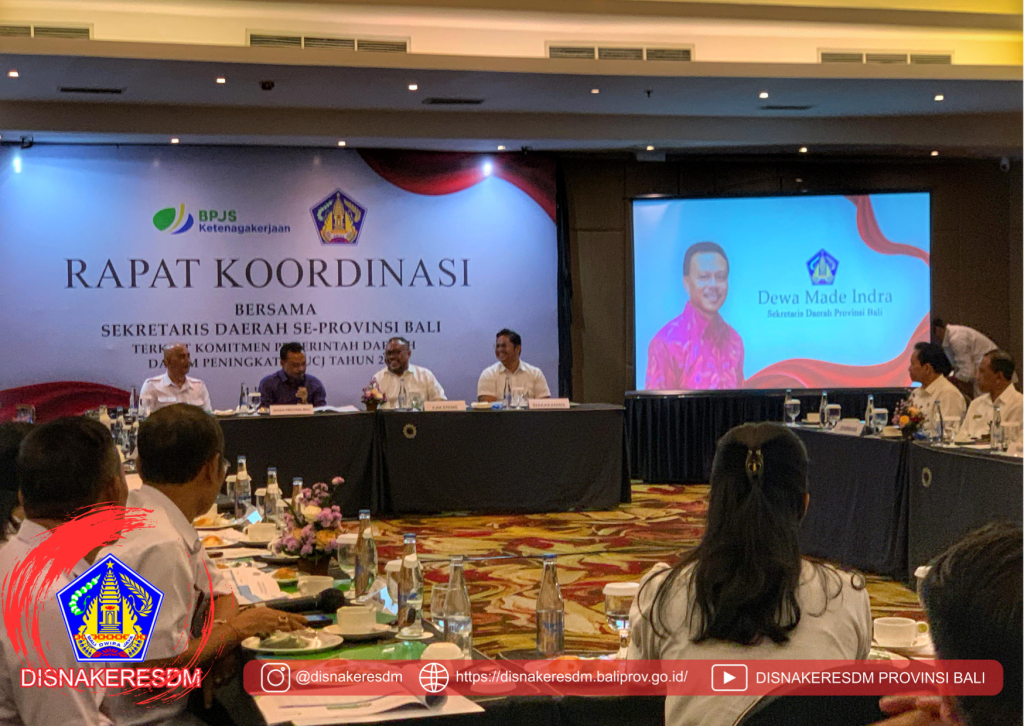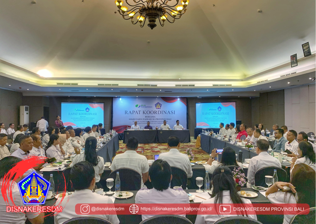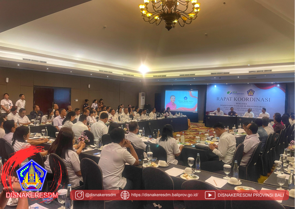 Kepala Dinas Ketenagakerjaan dan ESDM Provinsi Bali bersama pejabat fungsional mediator dan pengawas ketenagakerjaan menghadiri Rapat Koordinasi Bersama Sekretaris Daerah Kabupaten/Kota se-Bali. Rapat yang dibuka oleh Sekretaris Daerah Provinsi Bali ini bertujuan menguatkan sinergi dan koordinasi dalam optimalisasi pelaksanaan program Jaminan Sosial Ketenagakerjaan serta pengentasan kemiskinan dan penghapusan kemiskinan ekstrem di wilayah Bali.