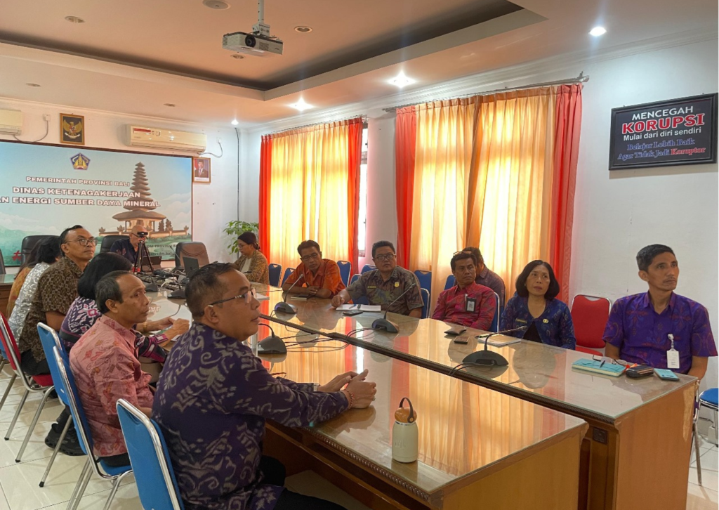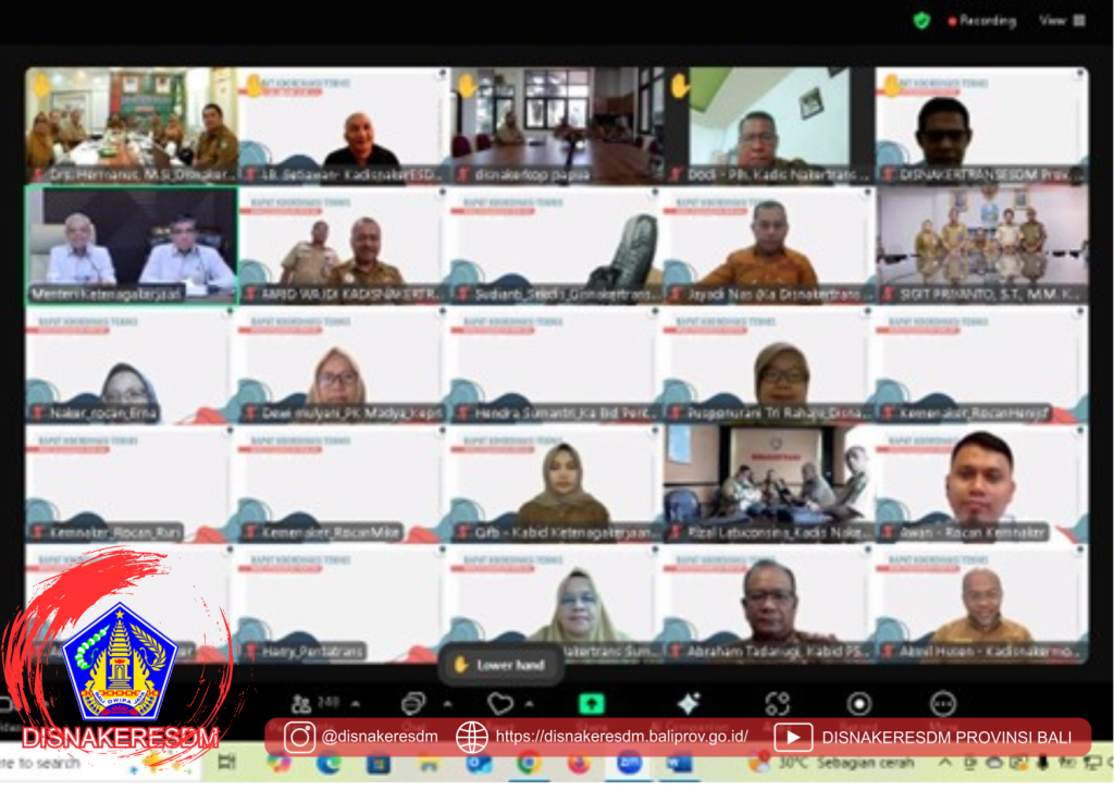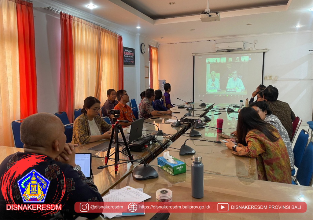 Kepala Dinas Ketenagakerjaan dan ESDM Provinsi Bali, didampingi Sekretaris Dinas, para Pejabat Administrator sektor ketenagakerjaan, Ketua dan perwakilan Asosiasi (APKI, AMHI, IKAPERJASI), serta Mediator Utama menghadiri Rapat Koordinasi Teknis (Rakornis) Bidang Ketenagakerjaan Tahun 2025 yang diselenggarakan secara daring.