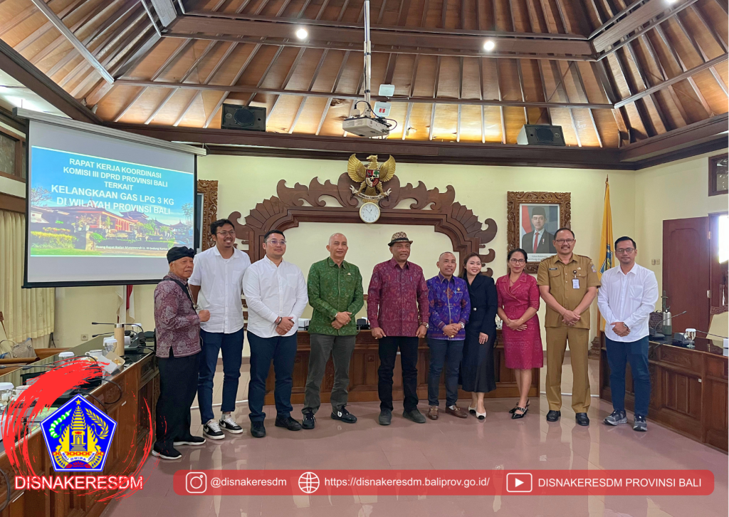 Kepala Dinas Ketenagakerjaan dan ESDM Provinsi Bali bersama Kabid ESDM menghadiri Rapat Koordinasi terkait dengan Kelangkaan Gas LPG 3 Kg di Wilayah Provinsi Bali. Rapat ini digelar dalam rangka pelaksanaan tugas dan fungsi pengawasan Komisi III DPRD Provinsi Bali Bidang Energi dan SDM.