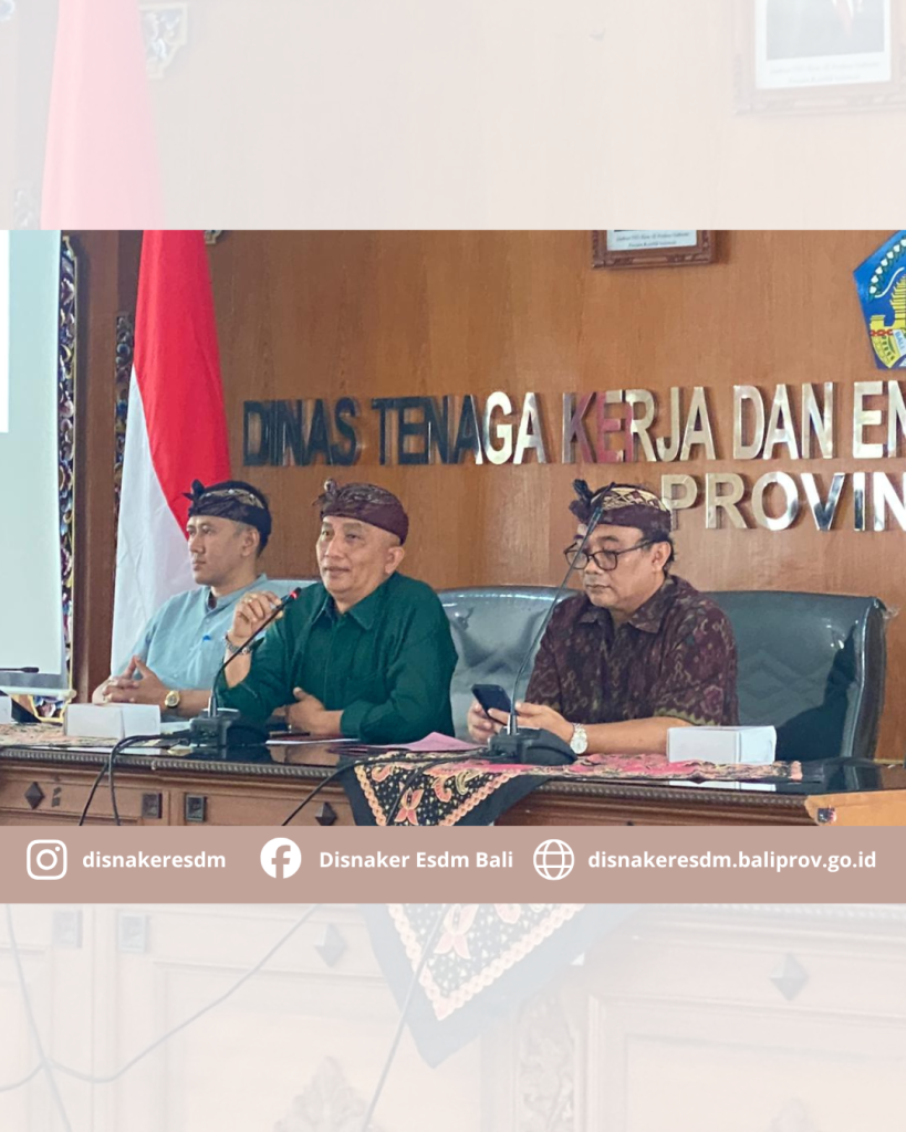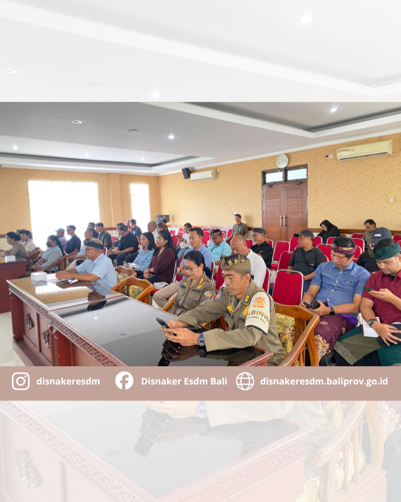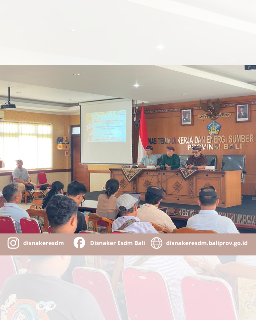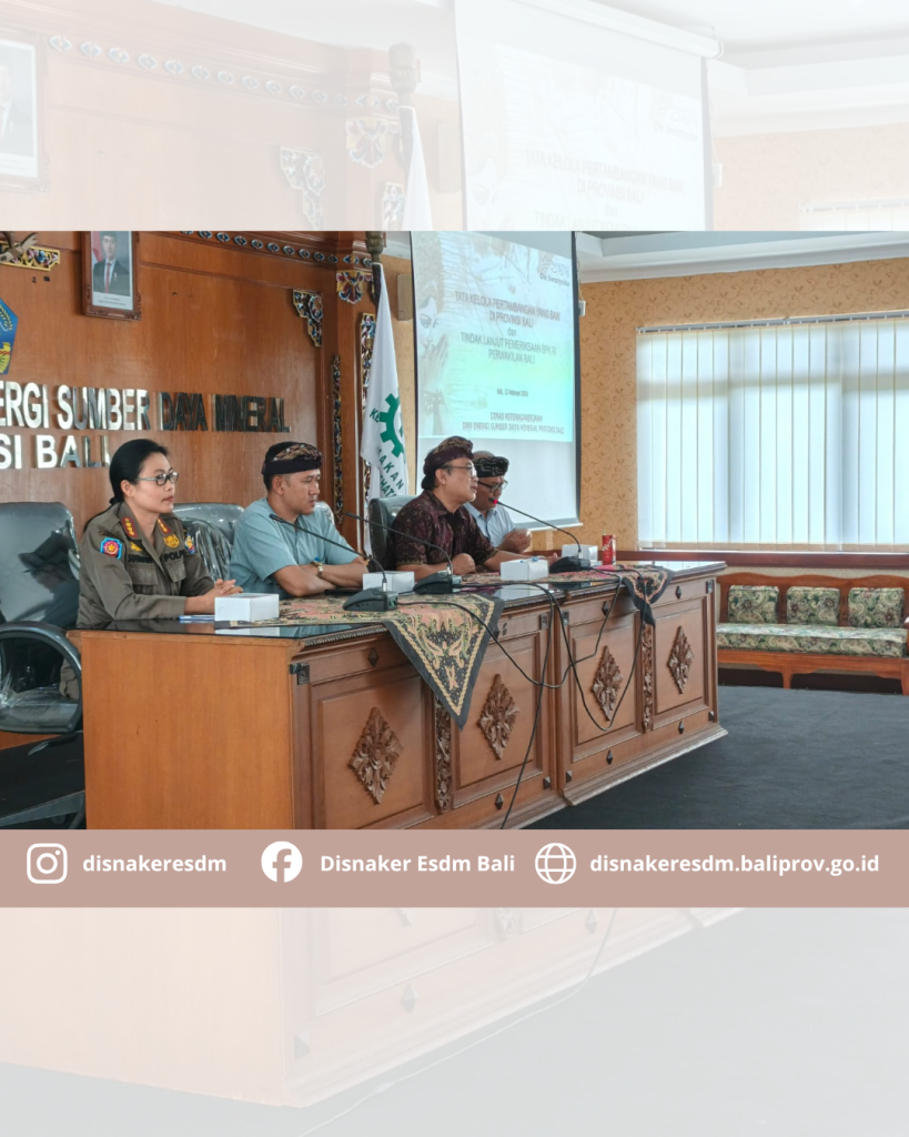 Kepala Dinas Ketenagakerjaan dan ESDM Provinsi Bali beserta jajaran memberi sambutan dalam acara Sosialisasi dan Pembinaan terhadap Badan Usaha pemegang IUP tahap Eksplorasi dan tahap Operasi Produksi tentang tata Kelola pertambangan yang baik. Kegiatan ini dilakukan dalam rangka menuju Tata Kelola Pertambangan Mineral Bukan Logam dan Batuan (MBLB) yang baik di Provinsi Bali dan tindak lanjut Pemeriksaan BPK RI Perwakilan Bali tentang Kepatuhan Penyelenggaraan Perlindungan dan Pengelolaan Lingkungan Hidupn serta Kehutanan atas Kegiatan Usaha Pertambangan Tahun Anggaran 2023 s.d Triwulan III 2025 pada Pemerintah Provinsi Bali.