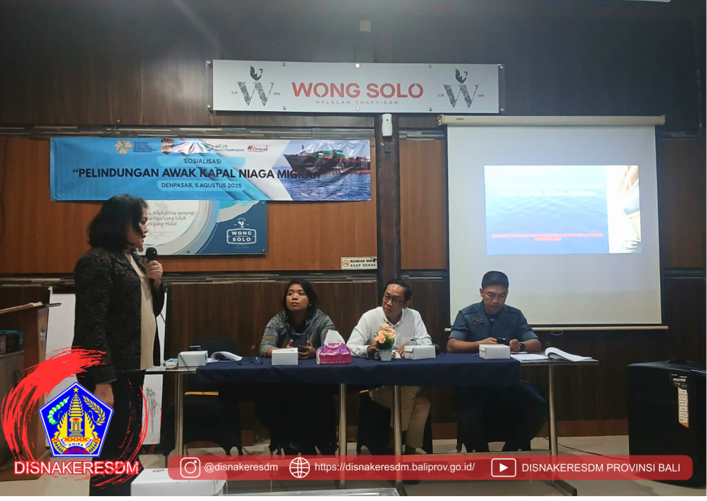 Kepala Bidang Bina Hubungan Industrial dan Pengawasan Ketenagakerjaan mewakili Kepala Dinas Ketenagakerjaan dan ESDM Provinsi Bali hadir sebagai narasumber dalam acara Sosialisasi Pelindungan Awak Kapal Niaga Migran yang diselenggarakan oleh BP3MI Denpasar.