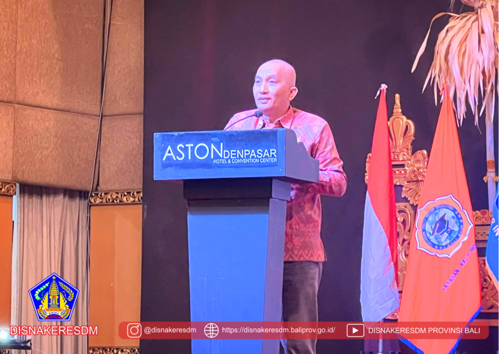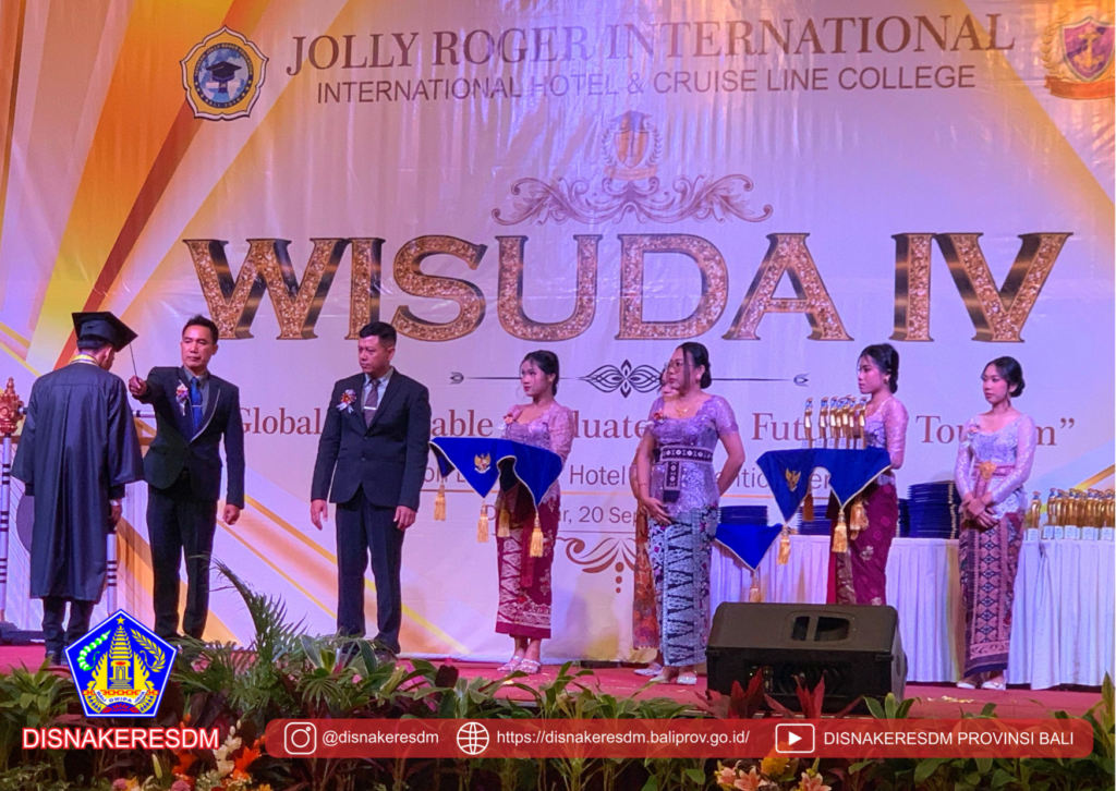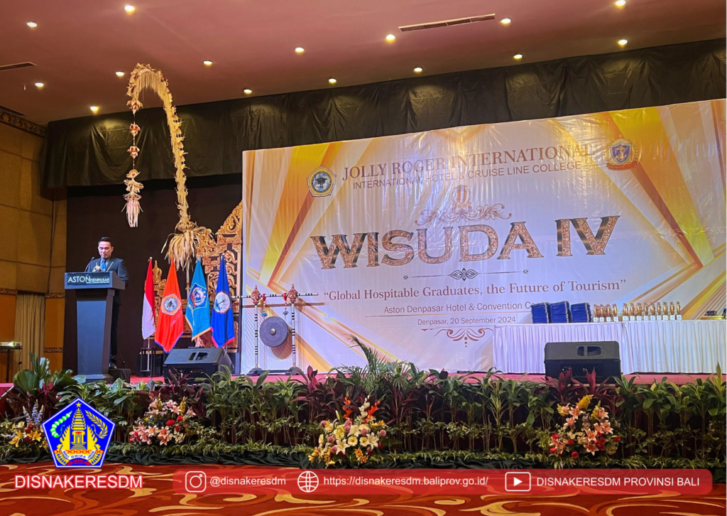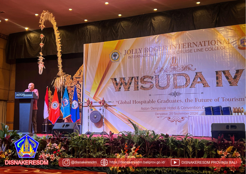 Kepala Dinas Ketenagakerjaan dan ESDM Provinsi Bali memberikan sambutan pada Wisuda IV Jolly Roger International, yang mengusung tema “Global Hospitable Graduates, the Future of Tourism”.