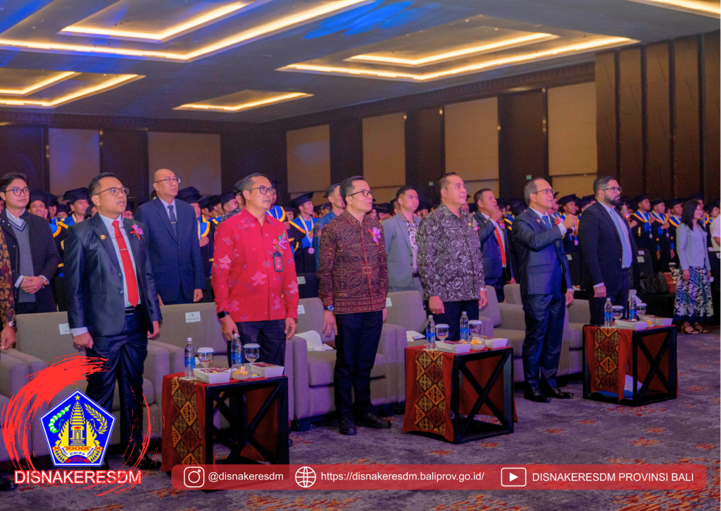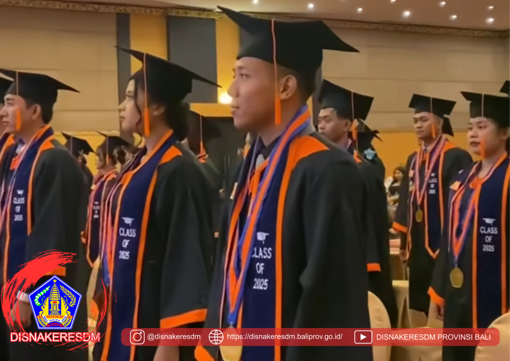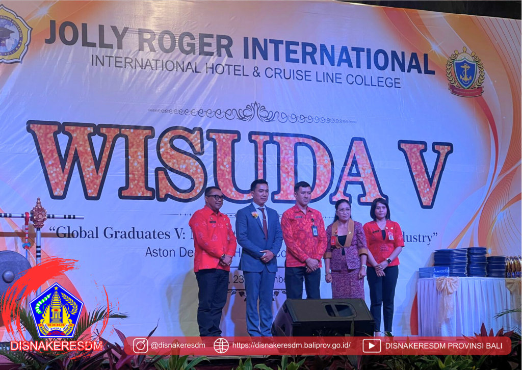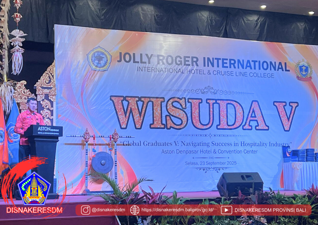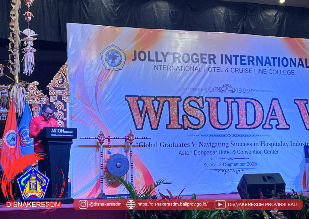 Sekretaris Dinas Ketenagakerjaan mewakili Kepala Dinas Ketenagakerjaan dan ESDM Provinsi Bali memberikan sambutan dalam acara wisuda V LPK Jolly Roger International yang diikuti oleh 69 wisudawan/ti.